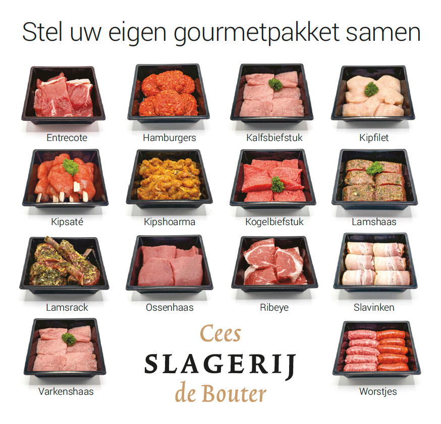 Wij hebben 14 soorten gourmet in aparte bakjes van ca. 200 gram verpakt. U kunt dus zelf aangeven hoeveel (makkelijk stapelbare) bakjes per soort vlees u wilt. De poster met ons assortiment hangt ook in de winkel en de kaarten waarop u uw bestelling kunt opgeven liggen daar voor u klaar.